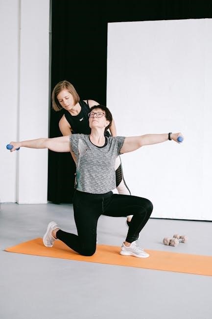 Focus on bodyweight exercises or lighter dumbbells to build a solid foundation. Modify complex movements like pull-ups with assisted variations or resistance band support. For cardio‚ begin with lower-impact options like walking‚ cycling‚ or swimming‚ gradually increasing duration and intensity.